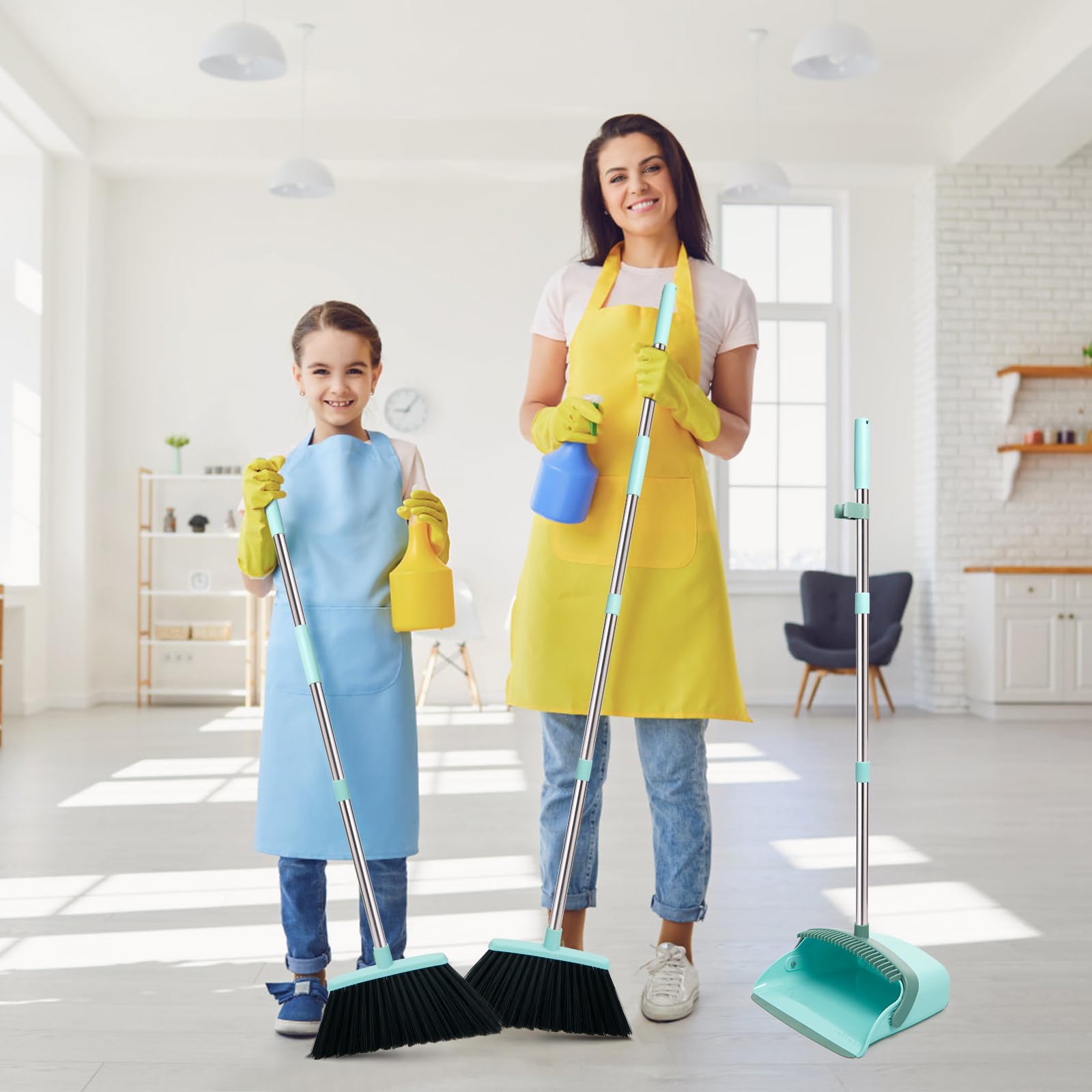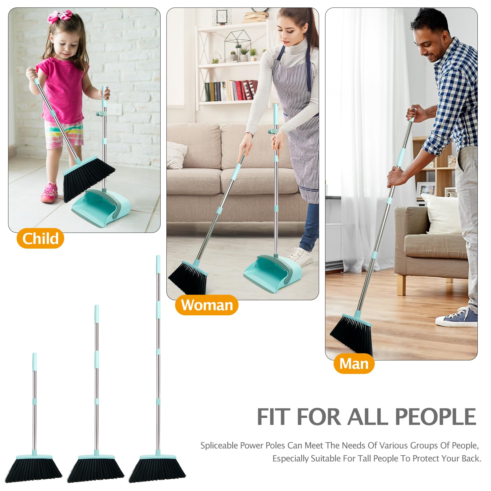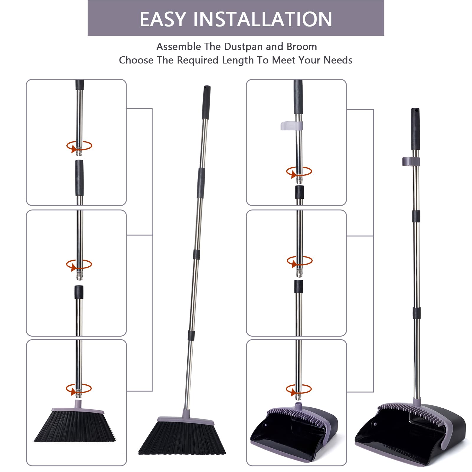 - [55.3" Long Handle Broom and Dustpan Set] Made of high-quality stainless steel poles with excellent performance in rust resistant, solid and light weight, which is easy to clean. Different people’s cleaning needs will be satisfied with the five extension poles which can be installed in different length. For example the children, adult and old man, especially for backache people, help you finish the sweeping jobs without bending.