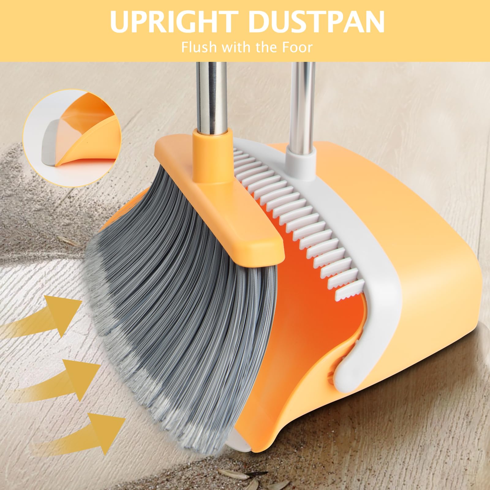 - [Excellent Features] Large dustpan space, with heighten baffles on both sides, is designed for hold more rubbish, avoiding the rubbish falling out; Thoughtful broom teeth help you clean the hair of women or pet more quickly and conveniently, and does not get on your hands; Upgraded four layers bristles are made of PET material, more robust and stiff to clean heavier garbage