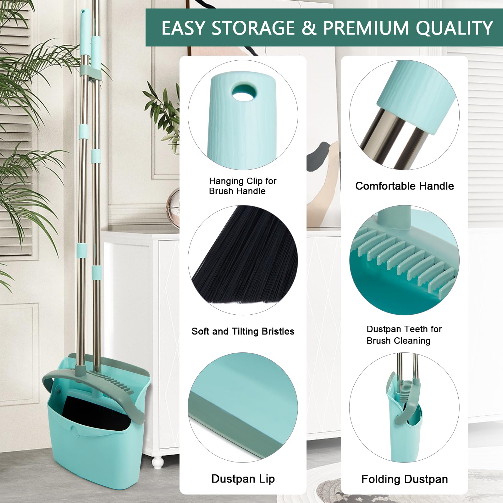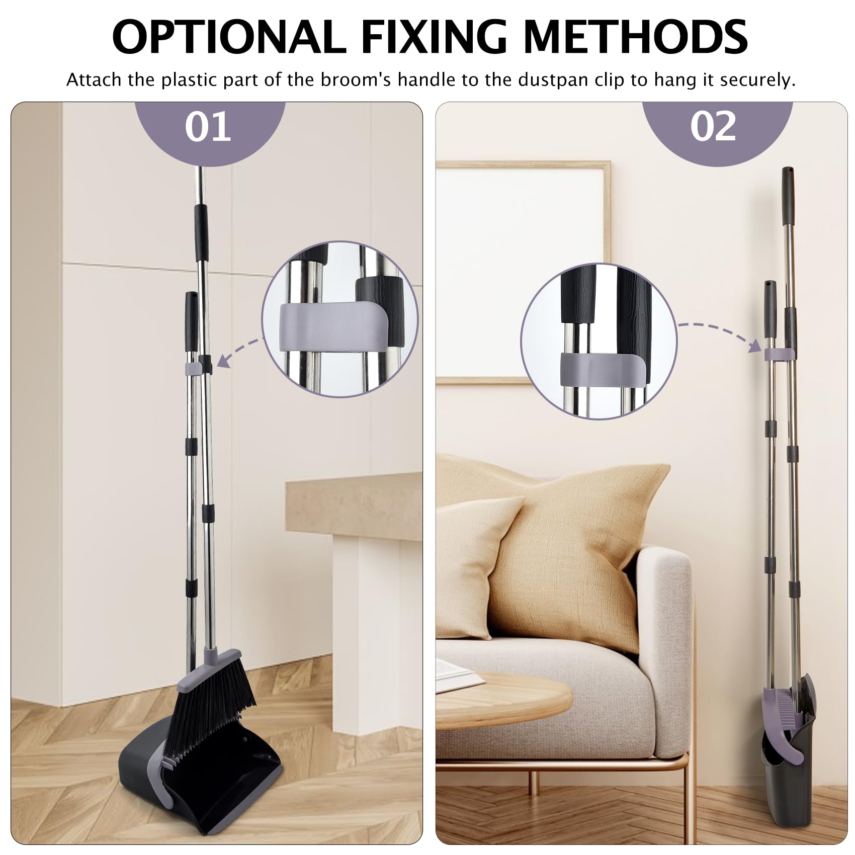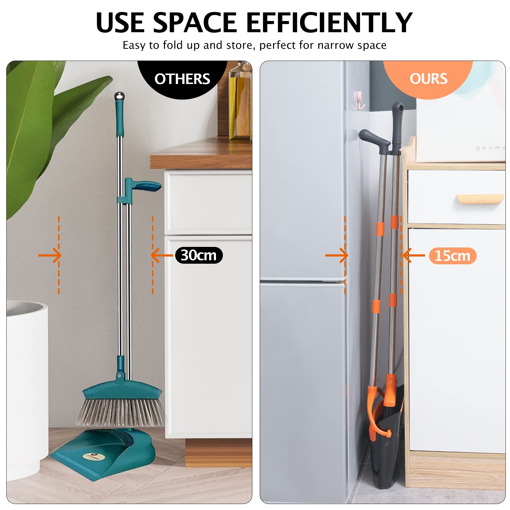 - [Easy Assembly] You just need screw the extension poles into the hole and quickly complete the installation. And the dustpan can be stored upright and easily put into a narrow space to make the room tidier and save space, if you want to hang it for storage, this broom can also meet your requirements. Our broom dustpan set is to bring great convenience to your life.