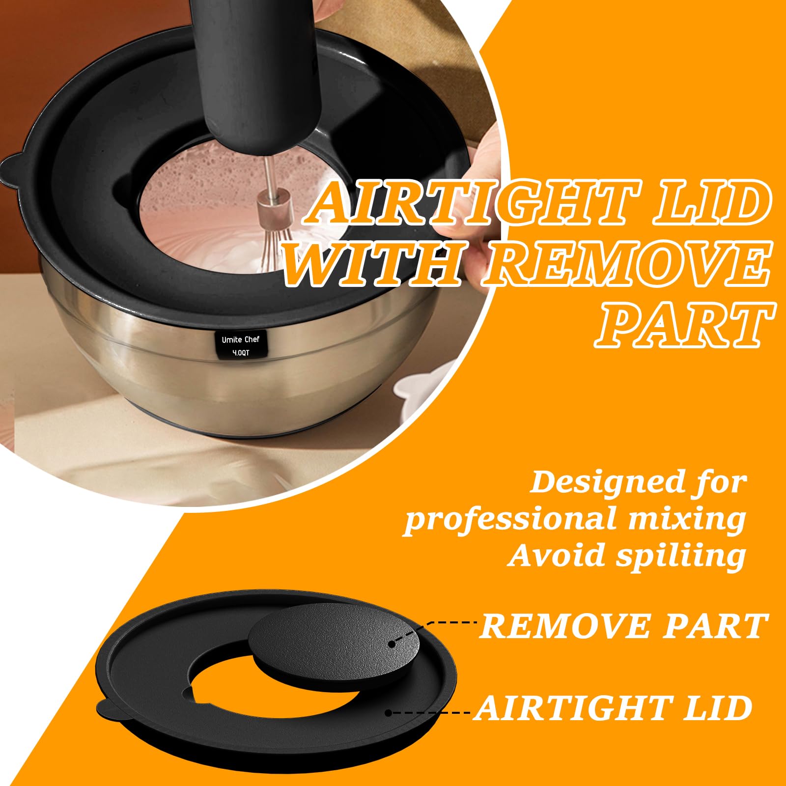 - AIRTIGHT LIDS & 3 GRATER ATTACHMENTS:The airtight lids that come with this mixing bowl set make it easy to store ingredients and leftovers without worrying about spills or leaks. 3.5qt had a removable lid inside the main lid, for adding contents or pairing it with your blender without removing the entire lid to prevent splash. This bowl set comes with 3 different grater attachments (slicing/grating/shredding) just shred or slice right into the bowl!
